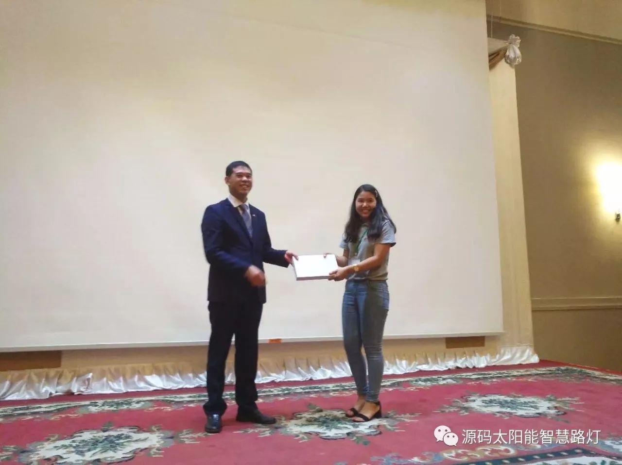 在答謝晚宴上,中國駐緬甸大使館領導向培訓會取得優異成績的優秀學員頒發了榮譽獎狀并給予了贊揚。同時也跟源碼進行了深度的交流,領導表示:源碼作為此次培訓會議的培訓講師,給緬甸的政府和行業人士傳遞了先進的新能源應用技術,是一件引以為榮的事情。太陽能路燈在緬甸的推廣有利于提高緬甸人民的生活品質,是一個民生工程,從國家層面或者從中國政府層面,都會大力的支持像源碼這樣的勇于走出去且具有社會責任感的新能源企業。同時,領導也給了源碼很多在緬甸推廣的一些建議。